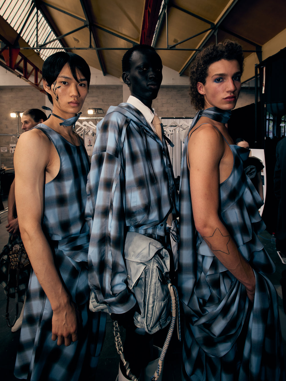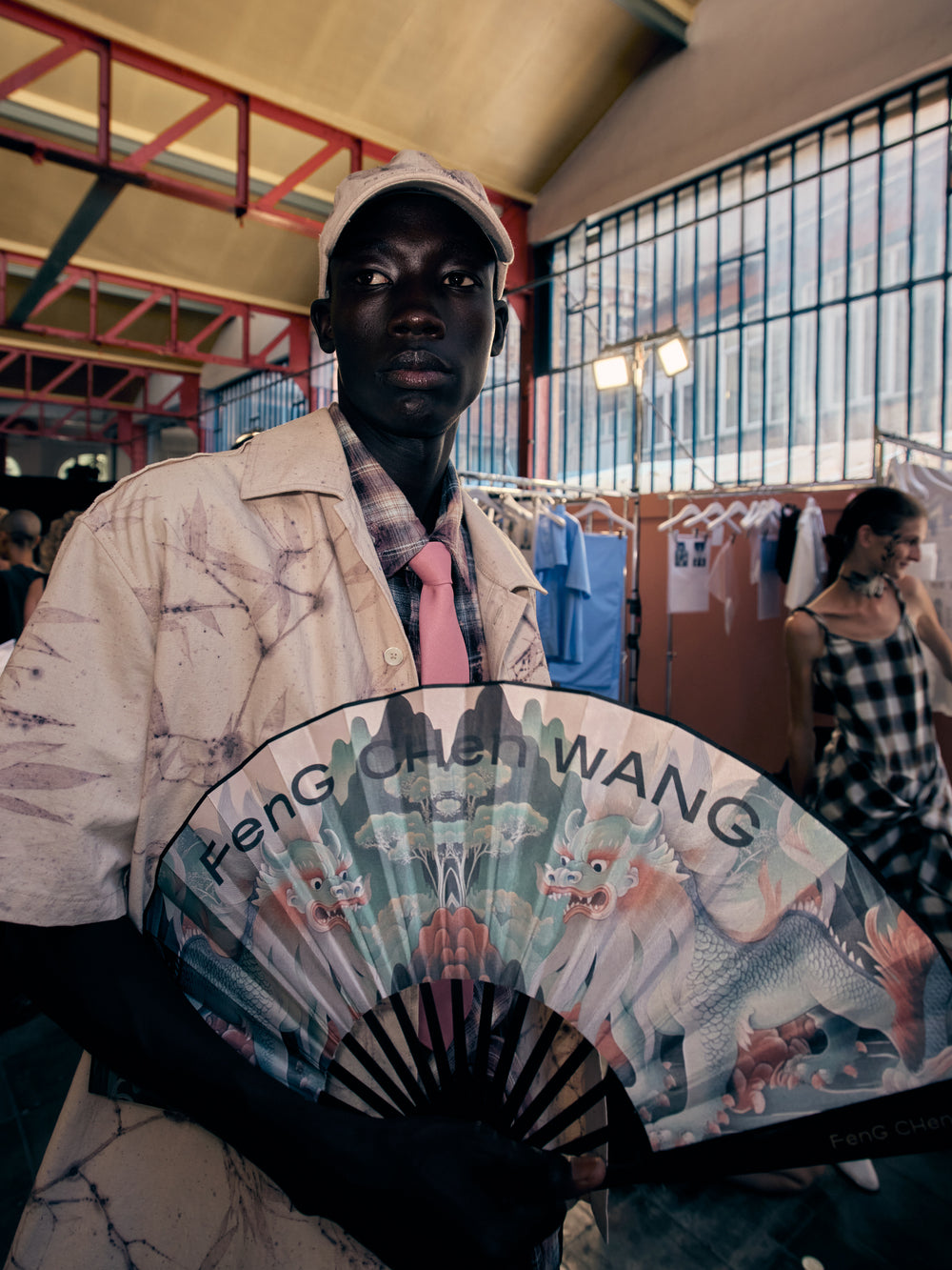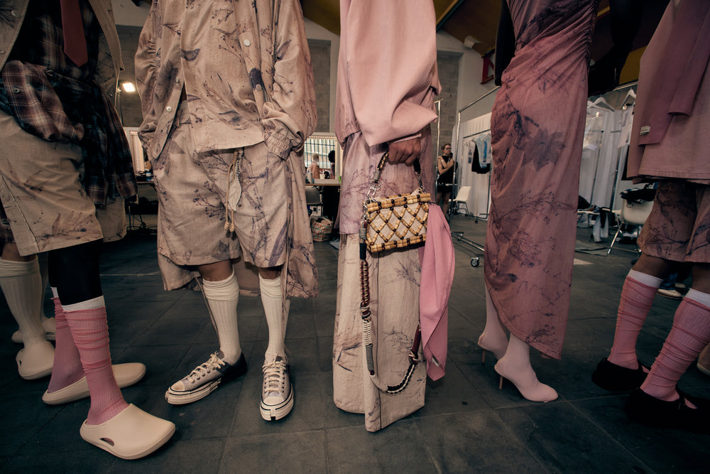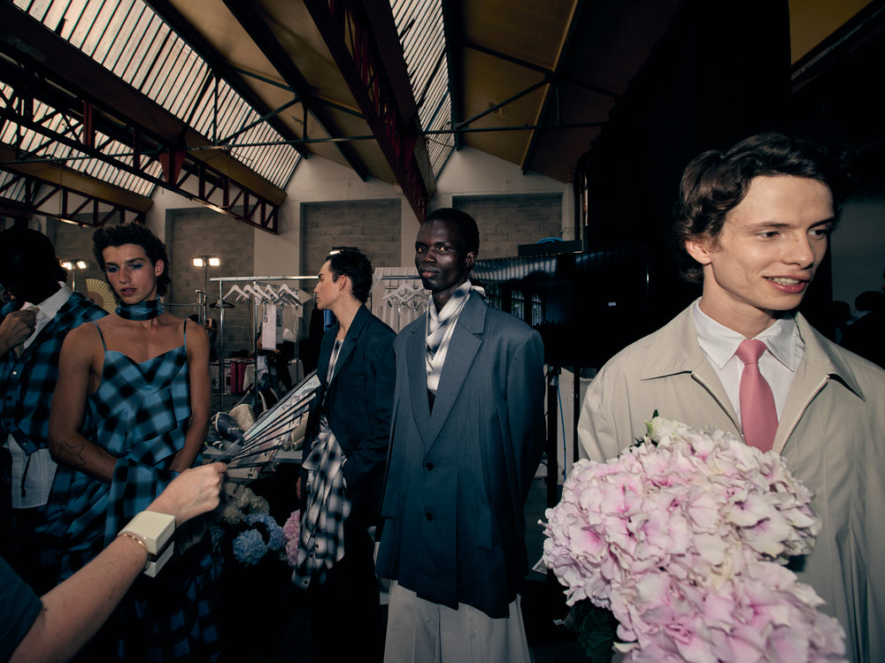 Backstage at Feng Chen Wang’s SS26 show, it’s less chaos, more quiet choreography - steam rising off pressed cotton, botanical prints breathing on hangers, Russell Westbrook laughing softly in the corner. There’s a stillness in the beauty here. GAFFER slipped behind the scenes to capture the moments before the runway, where every thread held meaning and every detail told a story. We spoke with Feng about process, purpose, and the emotional architecture of her latest collection, asking her about innovation, identity, and the quiet power of nature.